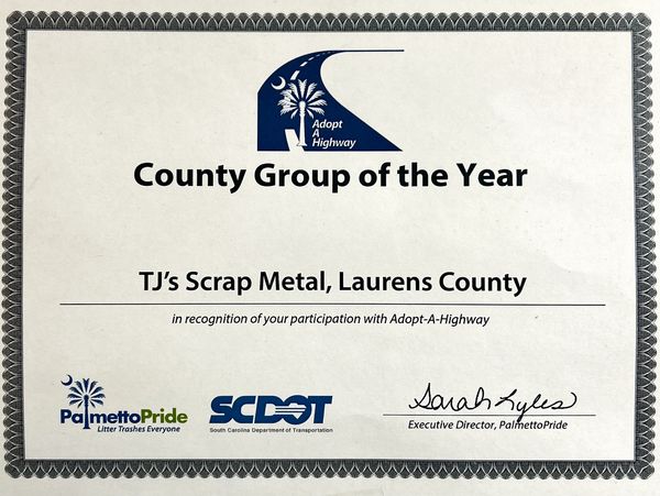 TJ's Scrap Metal was awarded County Group of the Year for its diligence in keeping Laurens County roads clean.